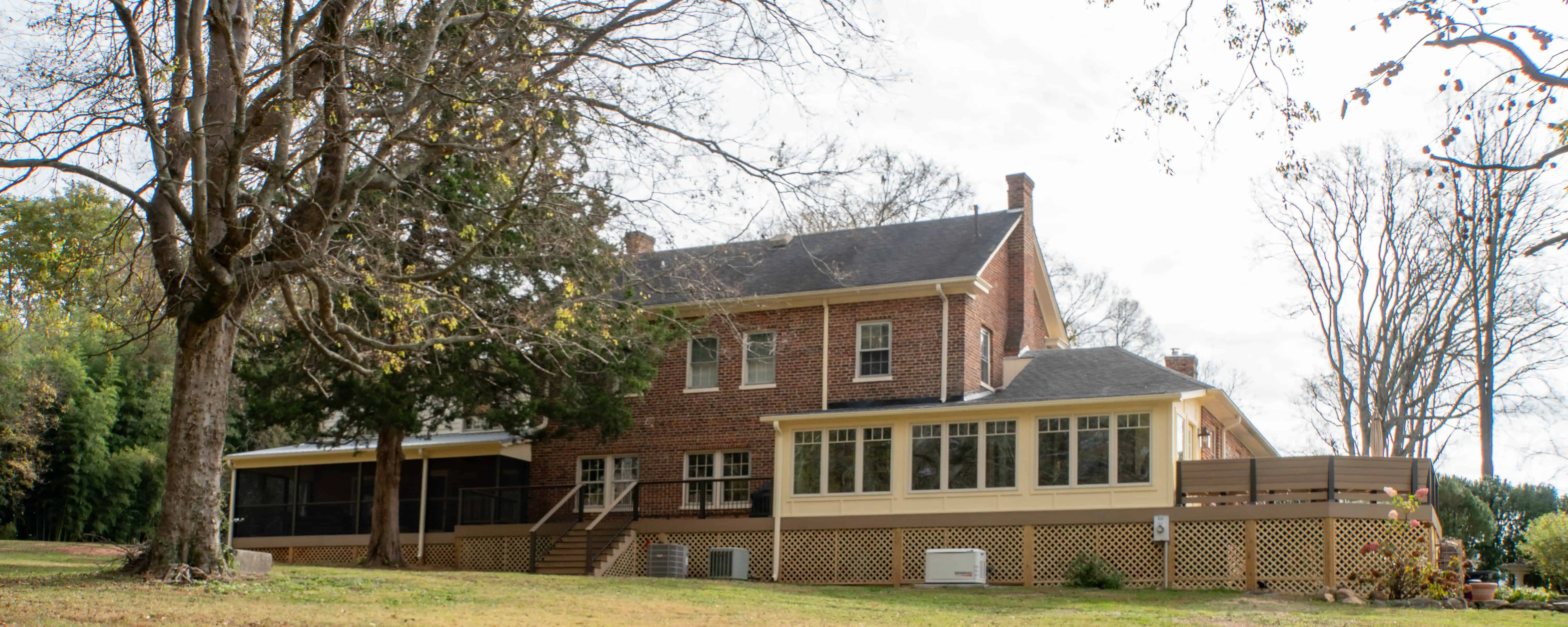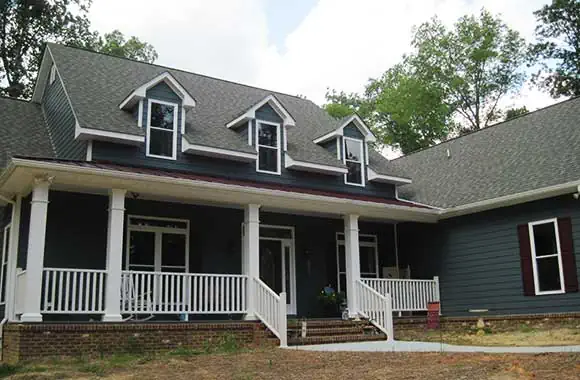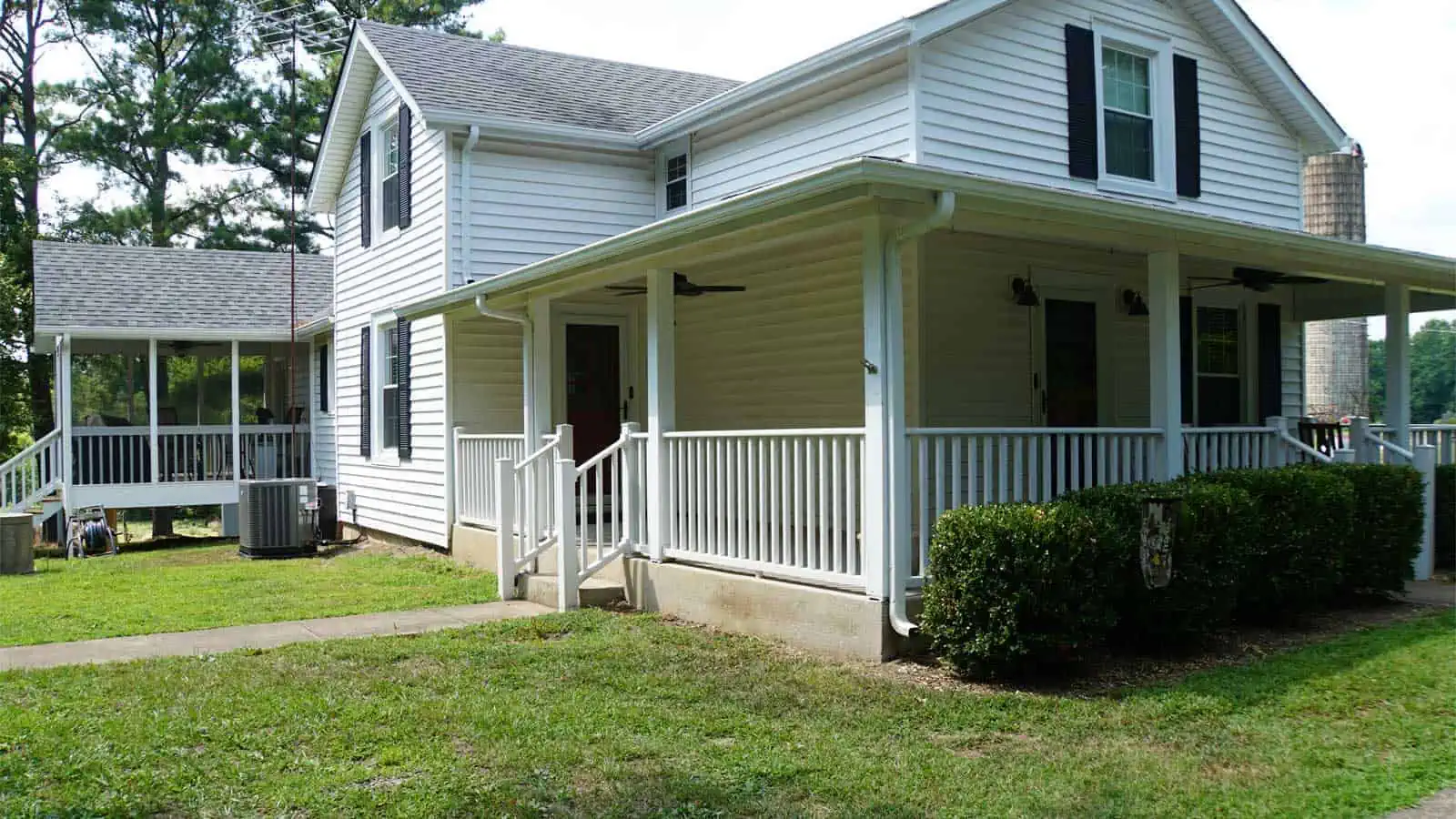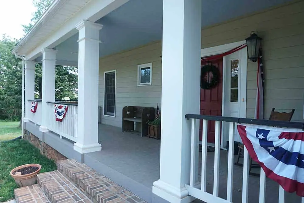 In the fall of 2019 we were contacted by Mr. and Mrs. Harrison here in Appomattox who wanted to upgrade their home with a new portico and porch renovation. For this project we coordinated with a local landscaping company and built the renovated porch when the landscaping work was completed. The new porch features painted, open pine rafters and columns locally milled by Grayson Ferguson Woodworking in Lynchburg and custom cut and built by our skilled carpenters. The project was further enhanced with new, painted caps on the deck and steps and new aluminum railings.