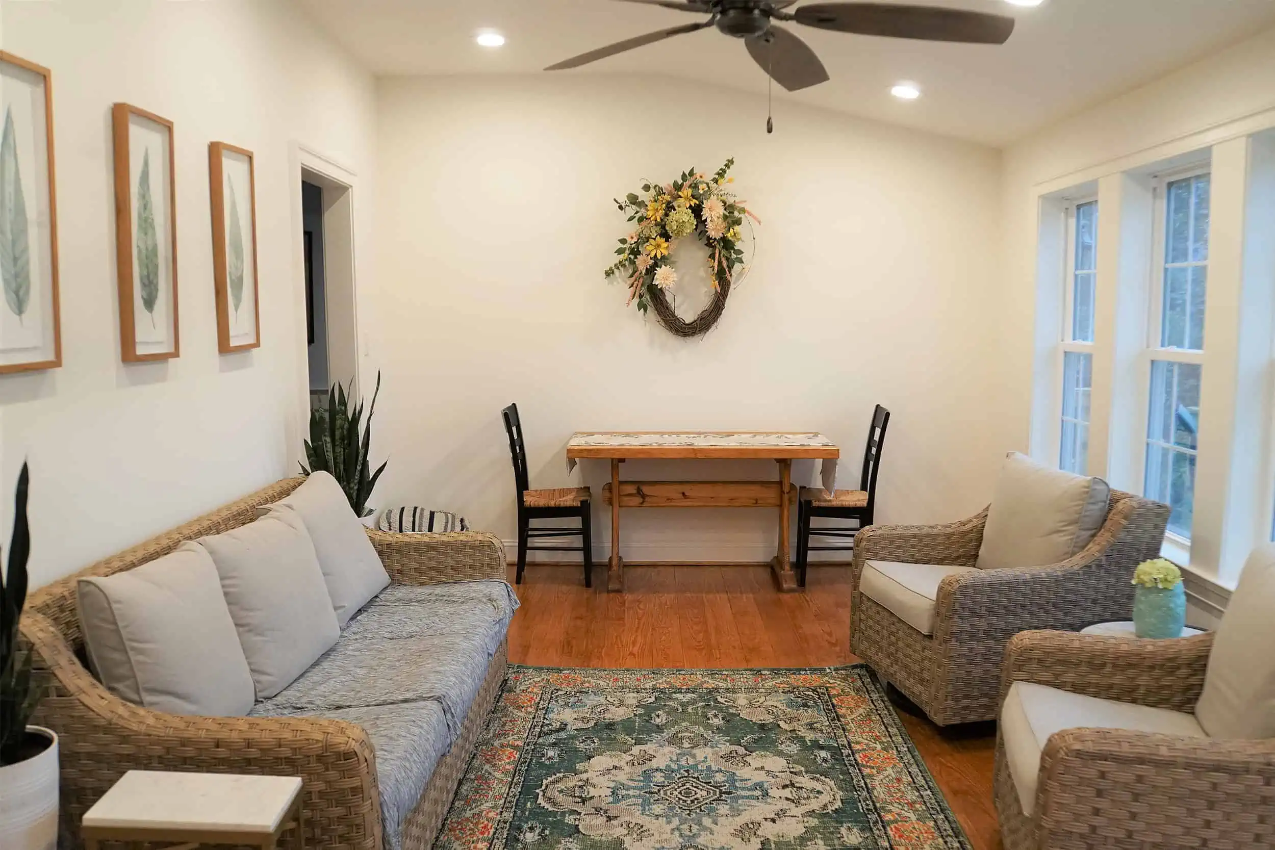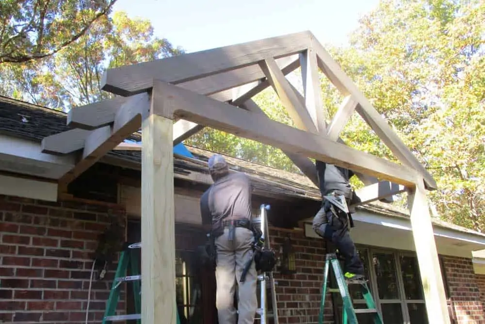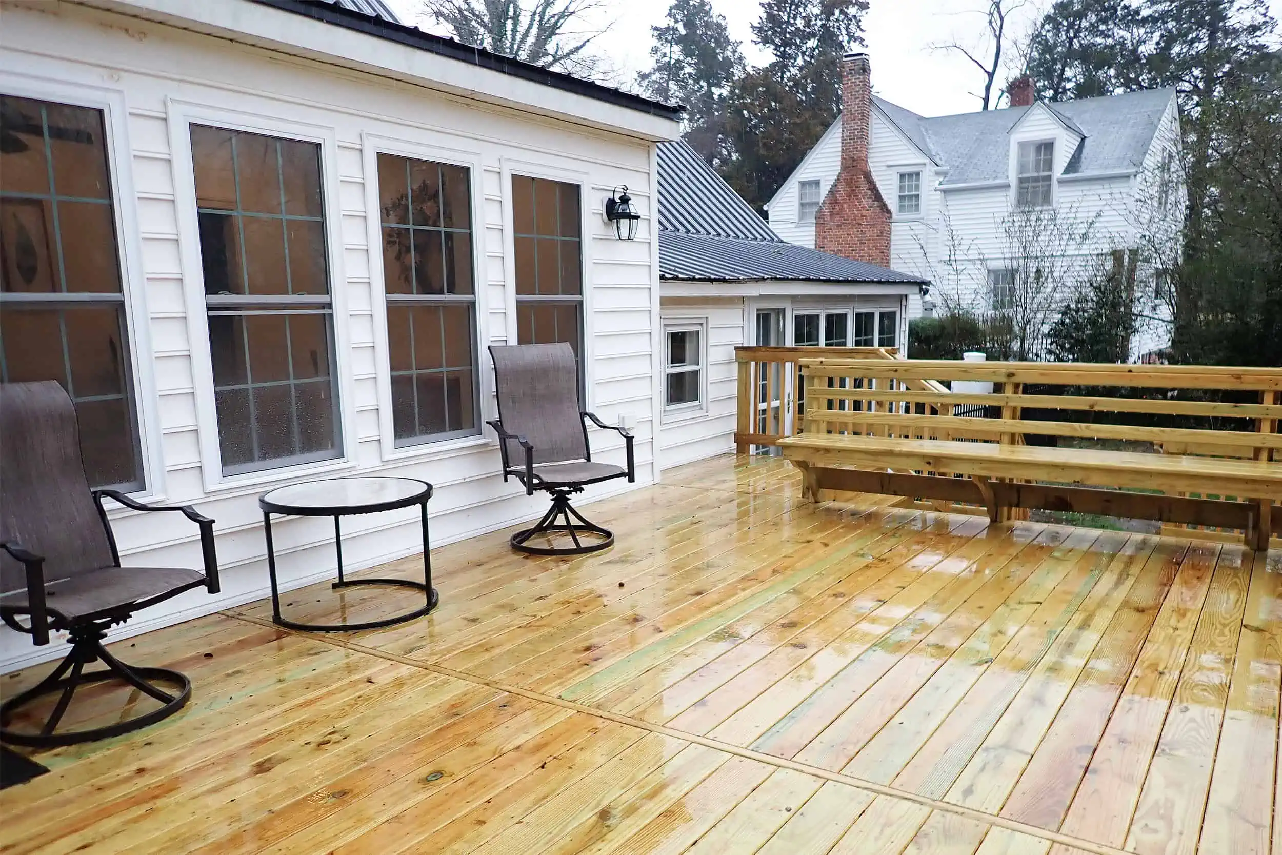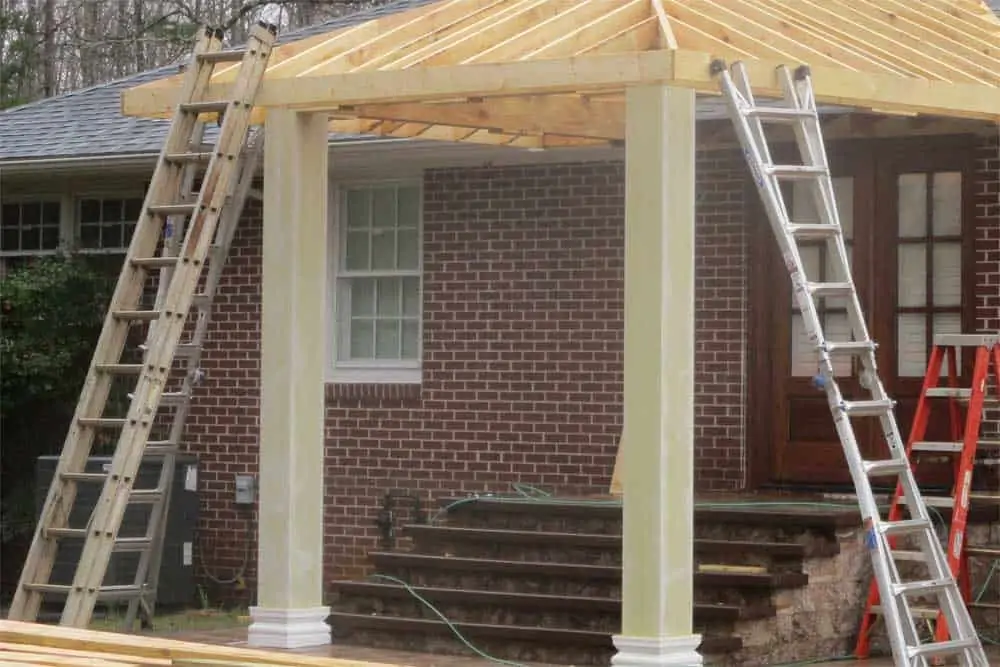 In the fall of 2019 we were contacted by Mr. and Mrs. Harrison here in Appomattox who wanted to upgrade their home with a new portico and porch renovation. For this project we coordinated with a local landscaping company and built the renovated porch when the landscaping work was completed. The new porch features painted, open pine rafters and columns locally milled by Grayson Ferguson Woodworking in Lynchburg and custom cut and built by our skilled carpenters. The project was further enhanced with new, painted caps on the deck and steps and new aluminum railings.