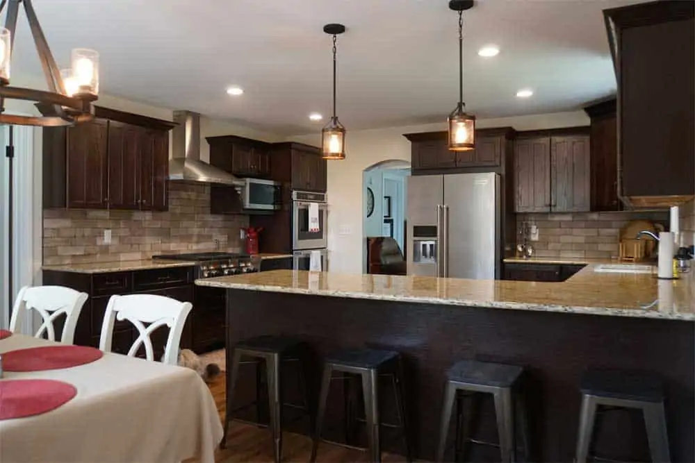 The living room had no lighting available other than lamps. Todd and his team created a new ceiling, complete with four recessed lights and a ceiling fan with a lighting feature. As an added luxury, Todd and his team wired for surround sound while the ceiling was under construction. This allowed for a seamless and professional look when it came time for his team to install the surround sound. Once a plain and boring fireplace, Todd and his team used stacked stone to add new life! Additional features of this project included beautiful custom built-in cabinets and shelving, as well as hidden electrical outlets and speaker wires.